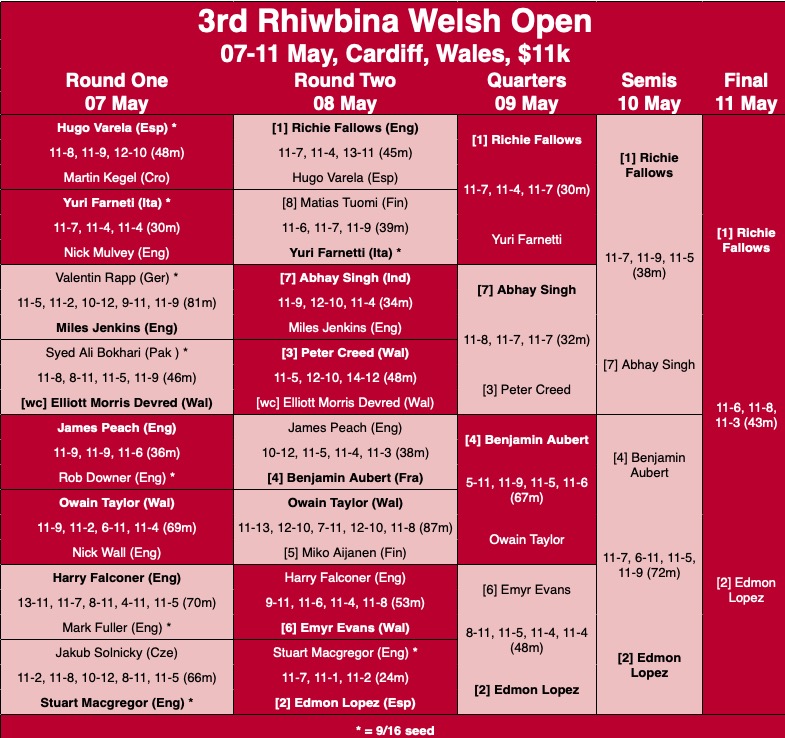 Fallows beat Italy’s Yuri Farnetti in straight games while Lopez came from a game down to beat Emyr Evans, Aubert did the same against wildcard Owain Taylor, and Singh upset third seed Peter Creed in straight games.