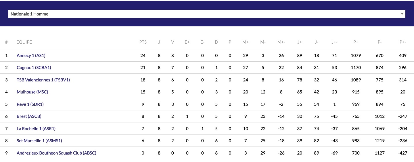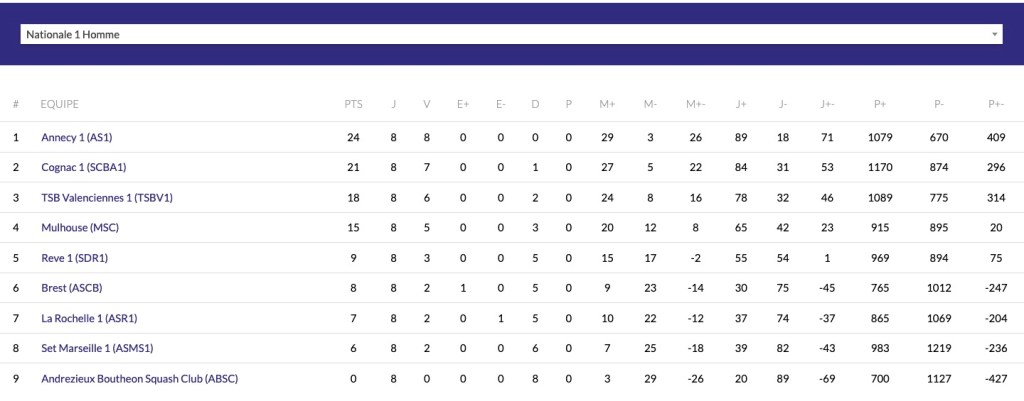 CHAMPIONAT DE FRANCE INTER-CLUB National 1 Squash club Cognac La Belle Allée 4éme journée du 5 avril 2025 _ classement 2éme play-off en juin 2025 Cognac-valenciennes Cognac-Brest Partager : Cliquer pour partager sur X(ouvre dans une nouvelle fenêtre) X Cliquez pour partager sur Facebook(ouvre dans une nouvelle fenêtre) Facebook J’aime chargement…