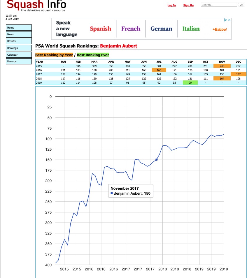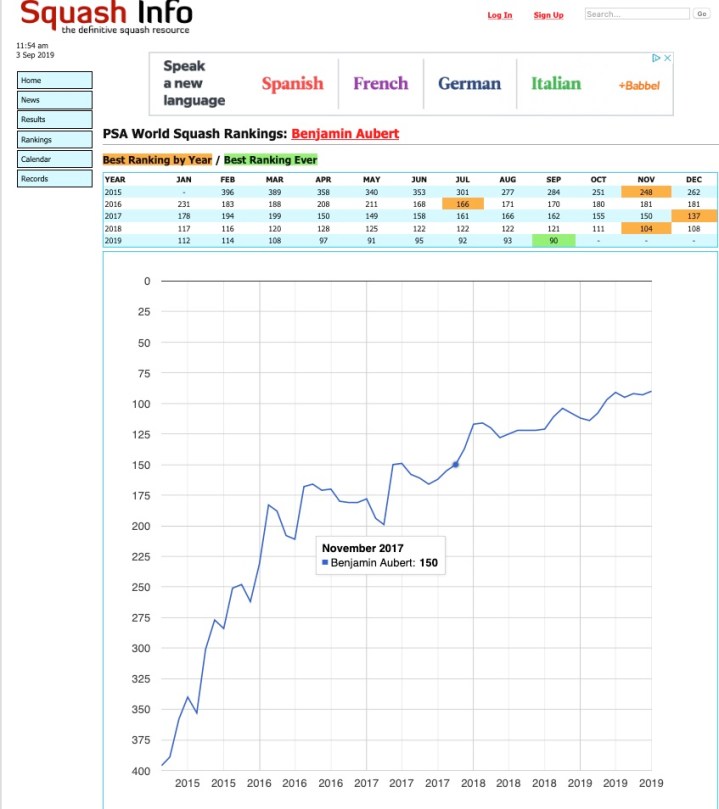 AUBERT Benjamin squash player 13 Français #50 World Ranking PSA meilleur classement