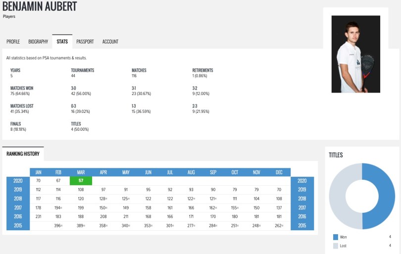 AUBERT Benjamin squash player 13 Français #50 World Ranking PSA meilleur classement