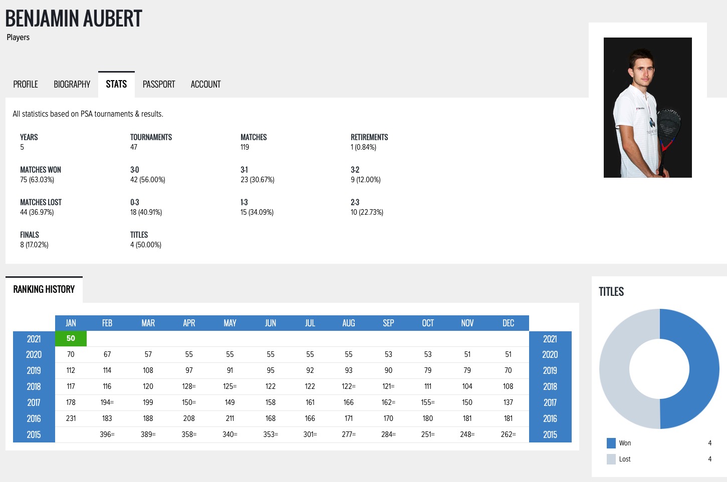 AUBERT Benjamin squash player 13 Français #50 World Ranking PSA meilleur classement