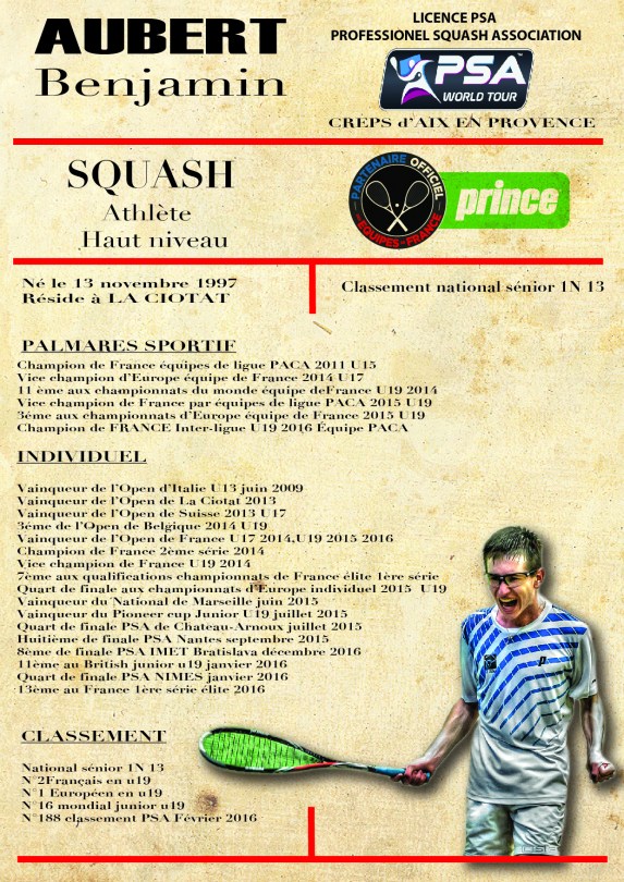 AUBERT Benjamin squash player 13 Français #50 World Ranking PSA meilleur classement