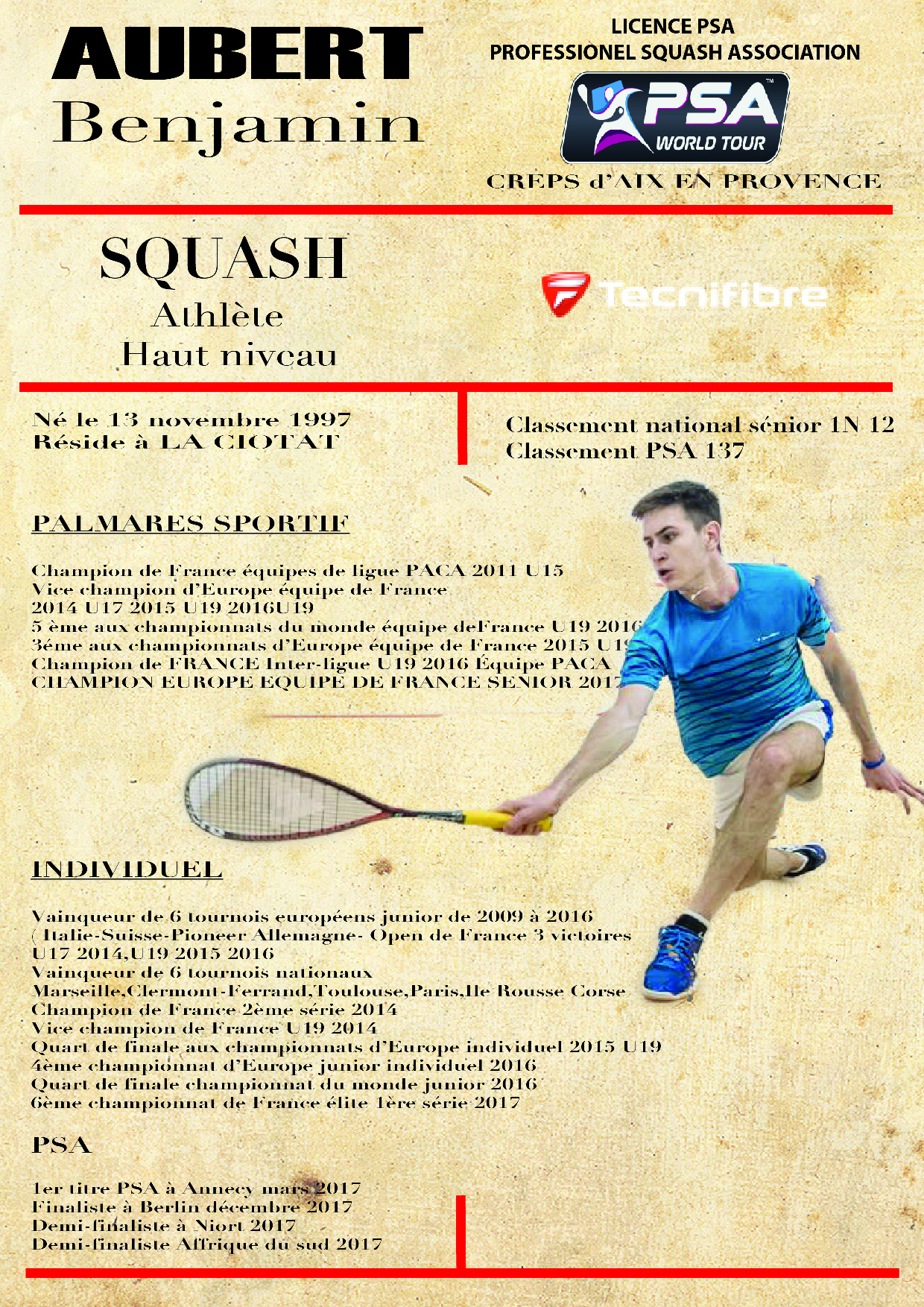 AUBERT Benjamin squash player 13 Français #50 World Ranking PSA meilleur classement