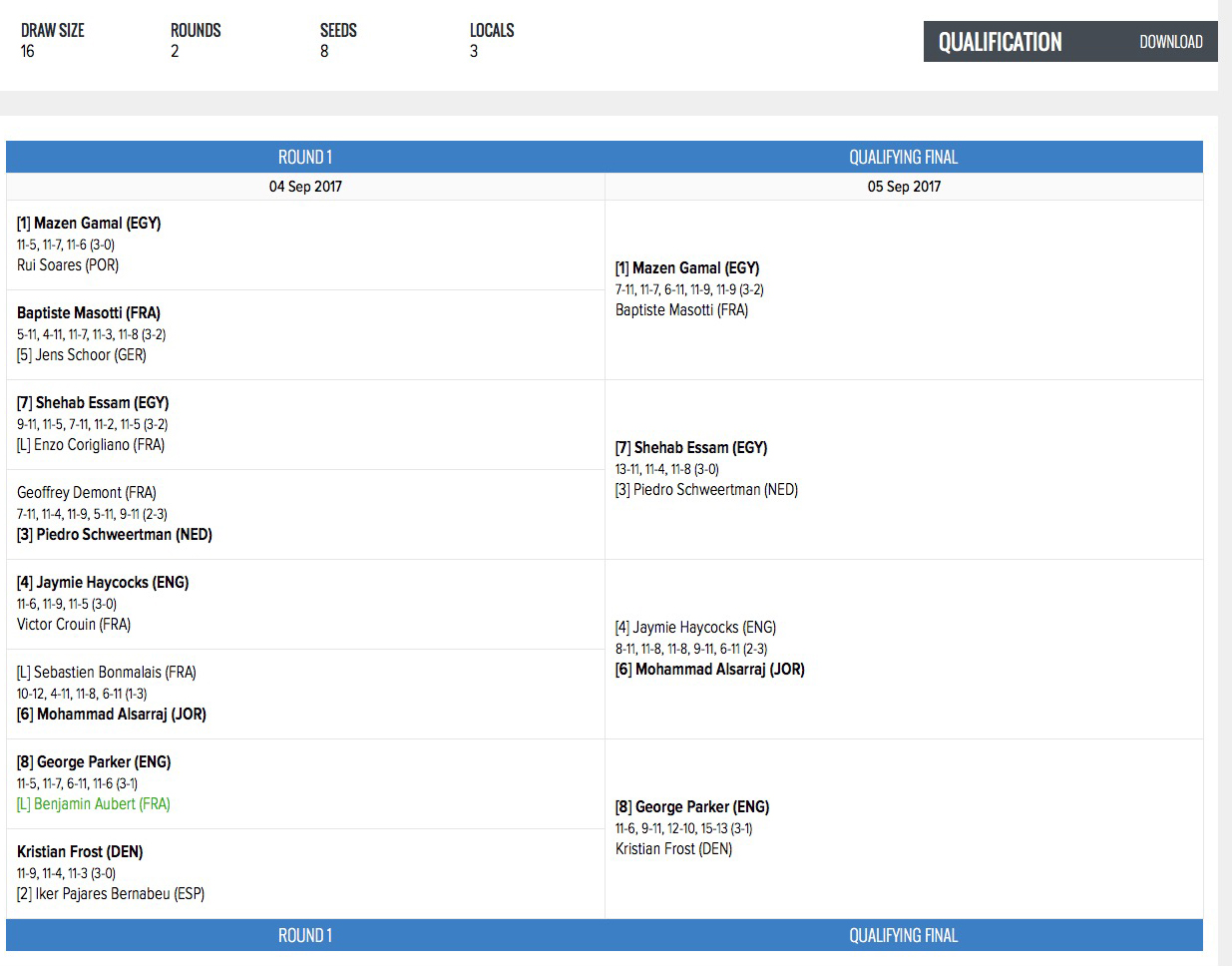 20h : Ct N°3 : [8*] George Parker (ENG) [L] Benjamin Aubert (FRA) : 11-5, 11-7, 6-11, 11-6 (53 min)