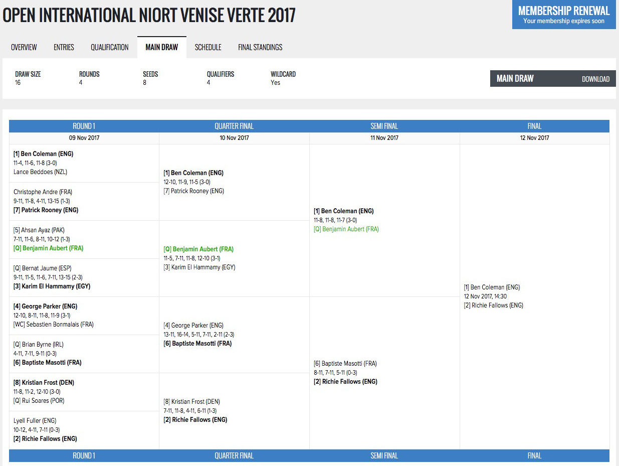 Benjamin Aubert bat la TS5 Ahsan Ayaz 3-1 (11/7 6/11 11/8 12/10)